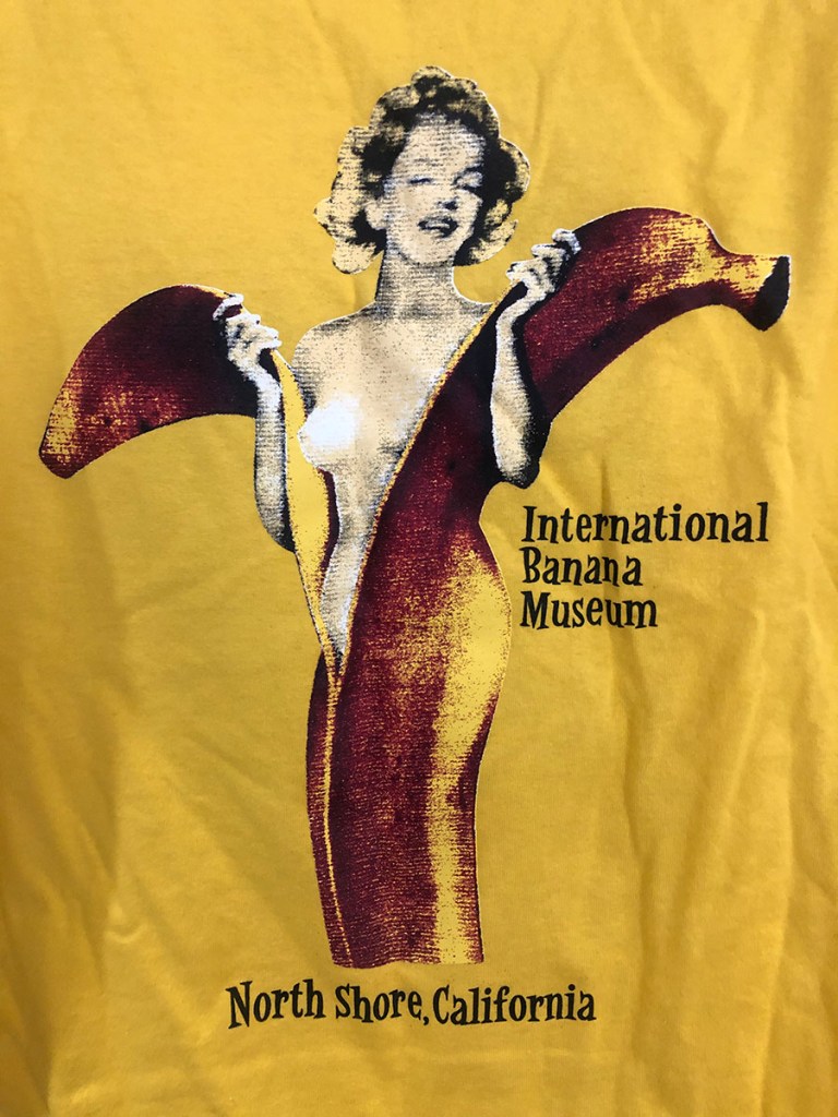 I had forgot I had this. Purchased at the International Banana Museum at the Salton Sea. This enticing banana is the entire back so it really stands out. A smaller one on the front. Funny how it would likely be banned on Facebook and Instagram.
