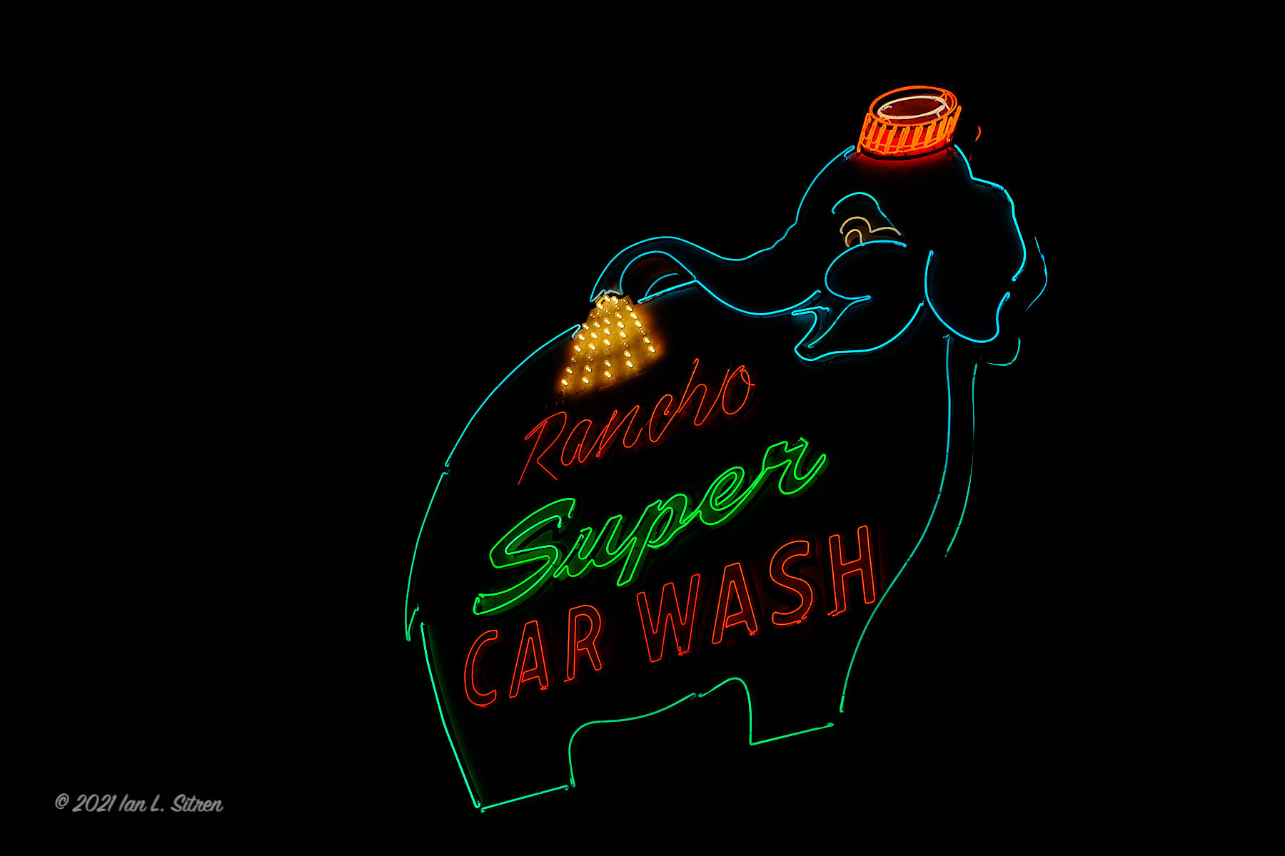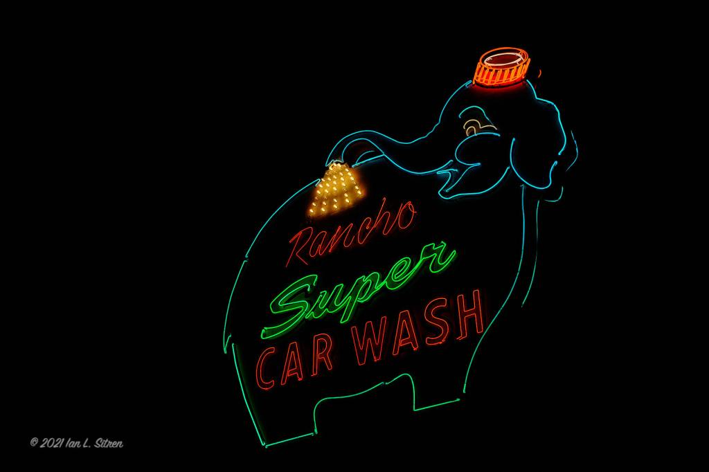A Mid-Century Modern neon sign, iconic to the Palm Springs area. Since the 1960’s a favorite for visitors and locals alike. The Rancho Super Car Wash is certainly better known as the Elephant Car Wash. Nostalgic, but I personally find it somewhat boring until now having photographed it at night. I especially like the video with the sound of the cars and trucks going by in the background.