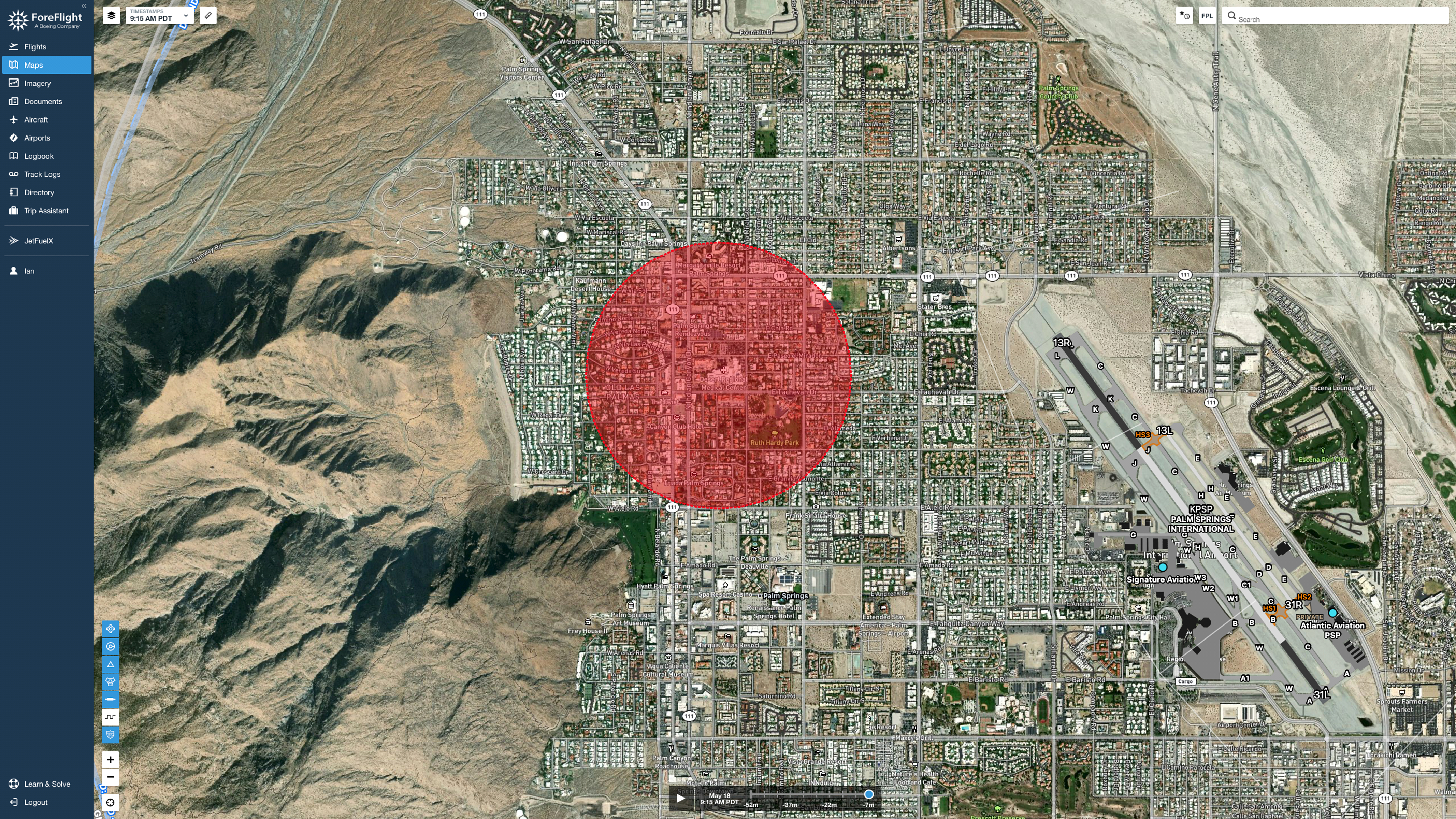 The map shown here, generated in ForeFlight, marks the restricted zone in red and highlights the proximity to Palm Springs International Airport and the surrounding neighborhoods.