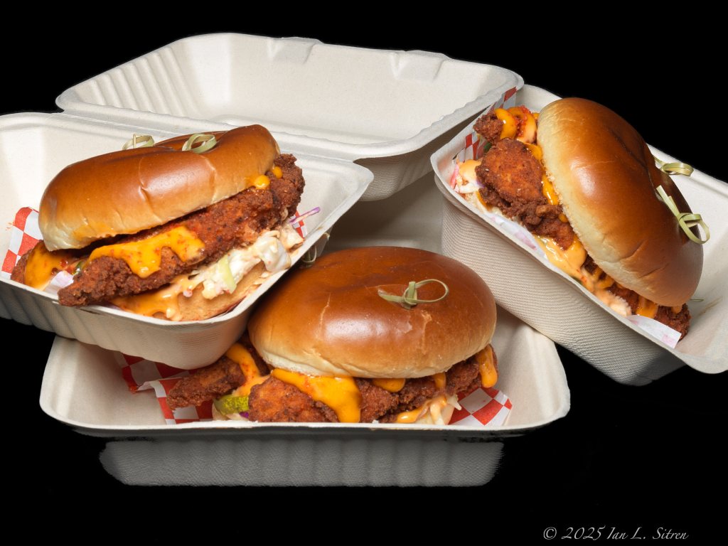 Today is National Fried Chicken Day, so I picked up these Jr sandwiches from Cluckin Bun, a Nashville-style chicken spot that’s popped up here in the Palm Springs area. This shot is a bit of behind the scenes—the sandwiches just as they came, still in the takeout packaging, before I photographed them unwrapped directly on the black background for my Bag to Background series.