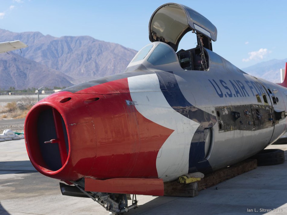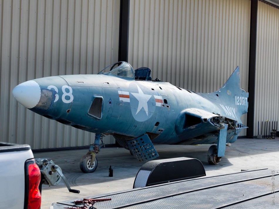 Just top it off with a quart of oil and good to go! Ok maybe not. Just brought in to the Palm Springs Air Museum yesterday morning. This is a Grumman F9F Panther. The Panther was the U.S. Navy’s first successful carrier based jet aircraft. It was also the aircraft of the Blue Angels from 1949 – 1954. There were 1,382 built and today it is a very rare aircraft. It will go through extensive renovation at the Air Museum and before too will be on display looking like the day it came off the assembly line.