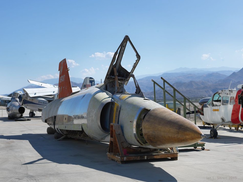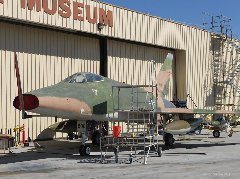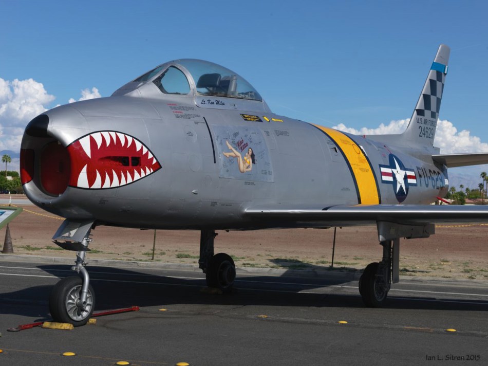 Last night at the Palm Springs Air Museum, the dedication and unveiling of the newly restored F-86 Sabre Jet by Museum Director Fred Bell. The F-86 was introduced during the Korean War and was met head on by the Soviet MiG-15. This MiG-15 will be flying today at the Air Museum following a one hour program at 1:00 PM. Be there! I will and with my camera!