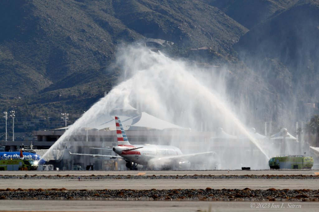 An American Airlines flight given a Fire Department water salute at the Palm Springs airport. Typically honoring a retiring aircraft. This was on March 3 2023.