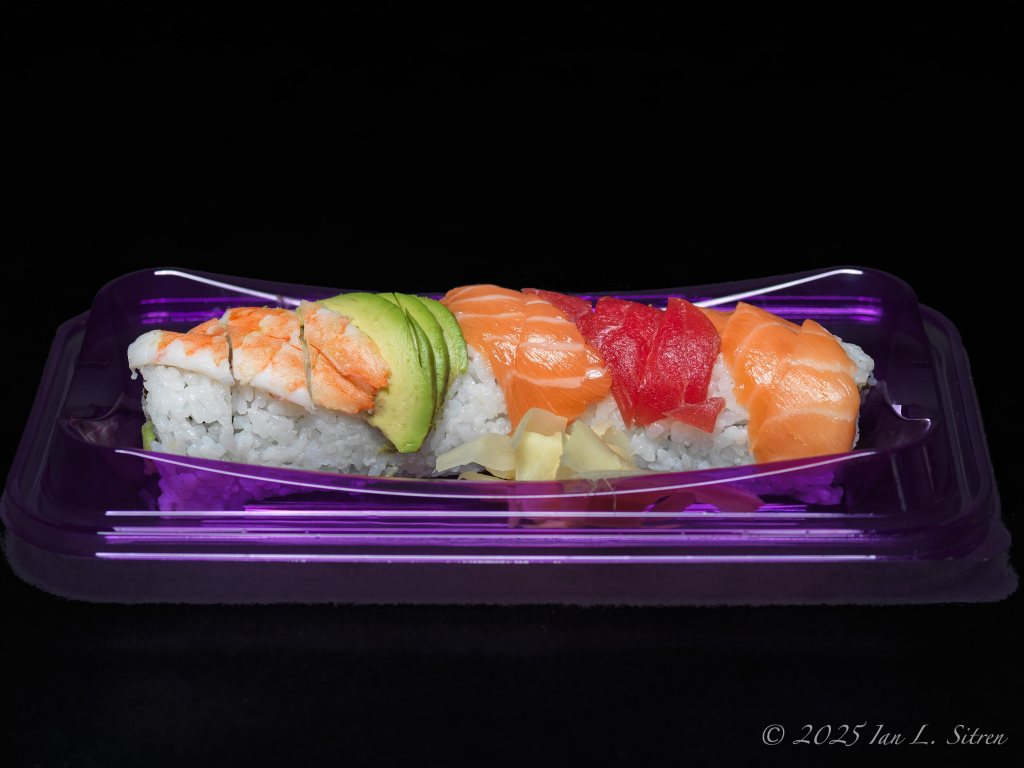 This photo is a bit of a departure from the rest of my From Bag to Background series. I usually photograph fast food with no bags, wrappers, or containers — just the food itself against a black background. But here, I left the container in. The purple tray added a visual contrast I didn’t want to ignore, and the sushi came already neatly arranged.