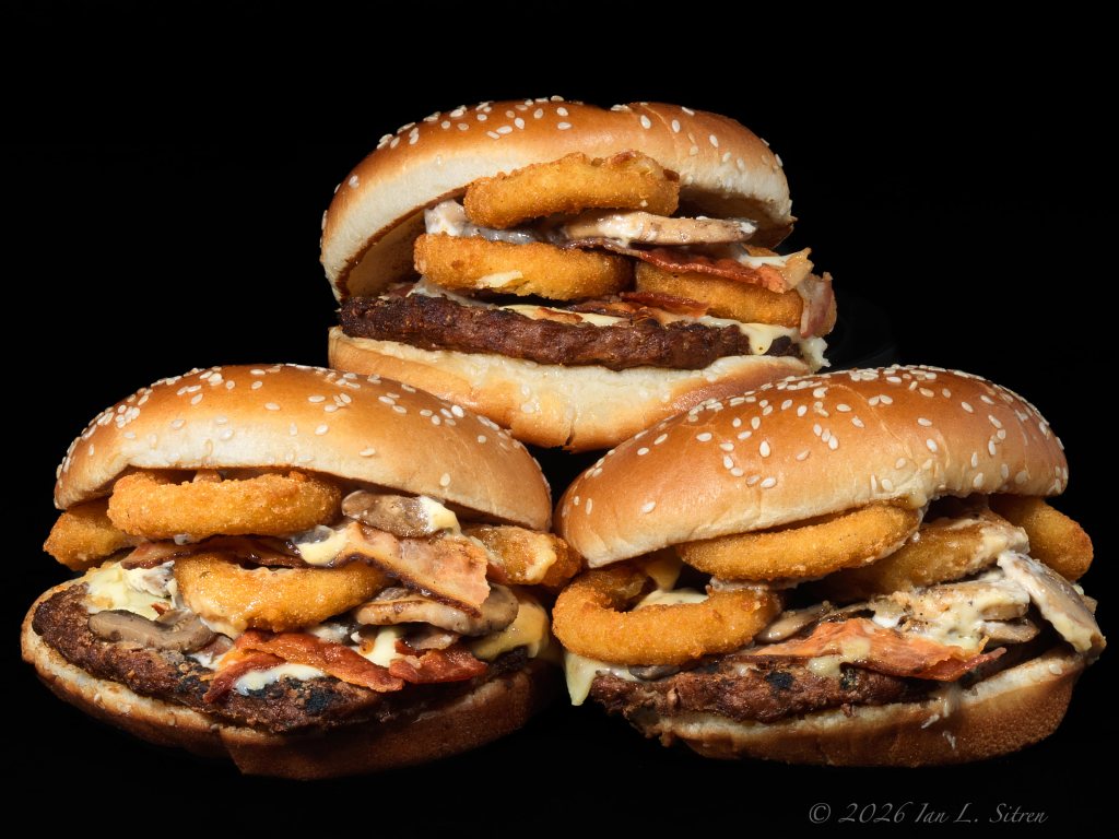 These are actual Burger King Whoppers and Double Whoppers, photographed as they came out of the bag — no styling, no manipulation, just carefully lit against a black background. And they look good — and in my opinion, taste good too.