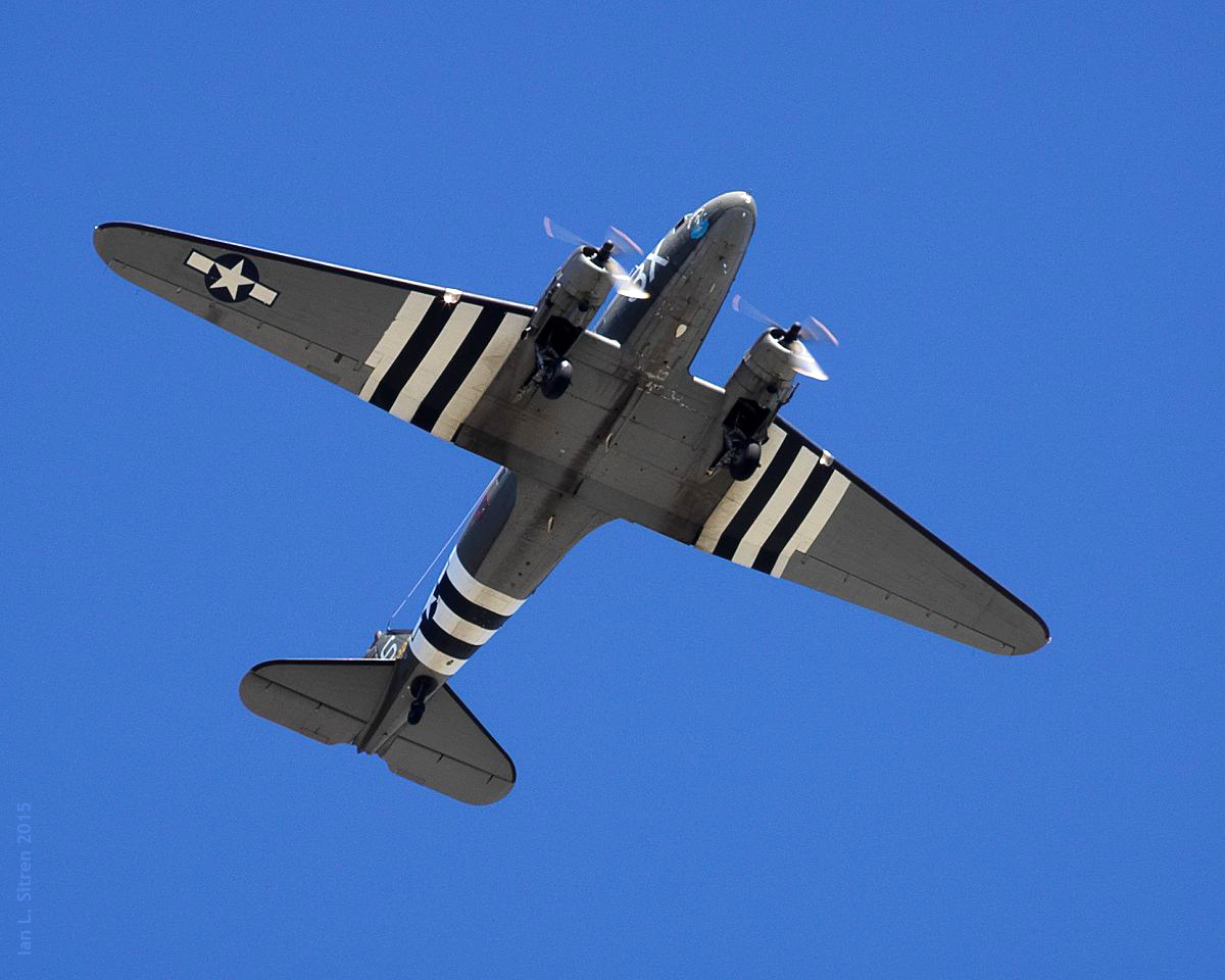 Overhead this morning, the C-47 Skytrain “Bunny” out of the Palm Springs Air Museum. It’s nose art is “What’s Up Doc”. In service for 58 years and here painted with 1944 D-Day Invasion stripes. Also known as “Gooney Bird” it can land almost anywhere even with no landing strip. As the DC-3 it was one of the earliest commercial passenger planes.