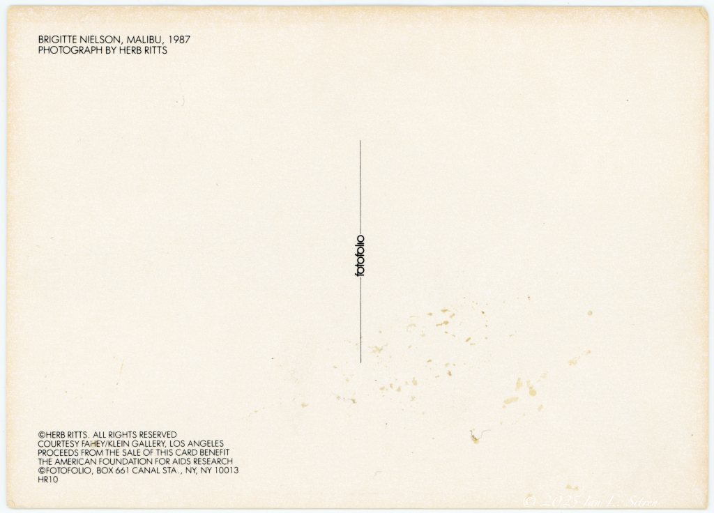 This is an original postcard featuring Brigitte Nielson, photographed by Herb Ritts in Malibu in 1987. Published by Fotofolio with the Fahey/Klein Gallery, it’s one of those cards that was more often collected than mailed—an art print in postcard form.