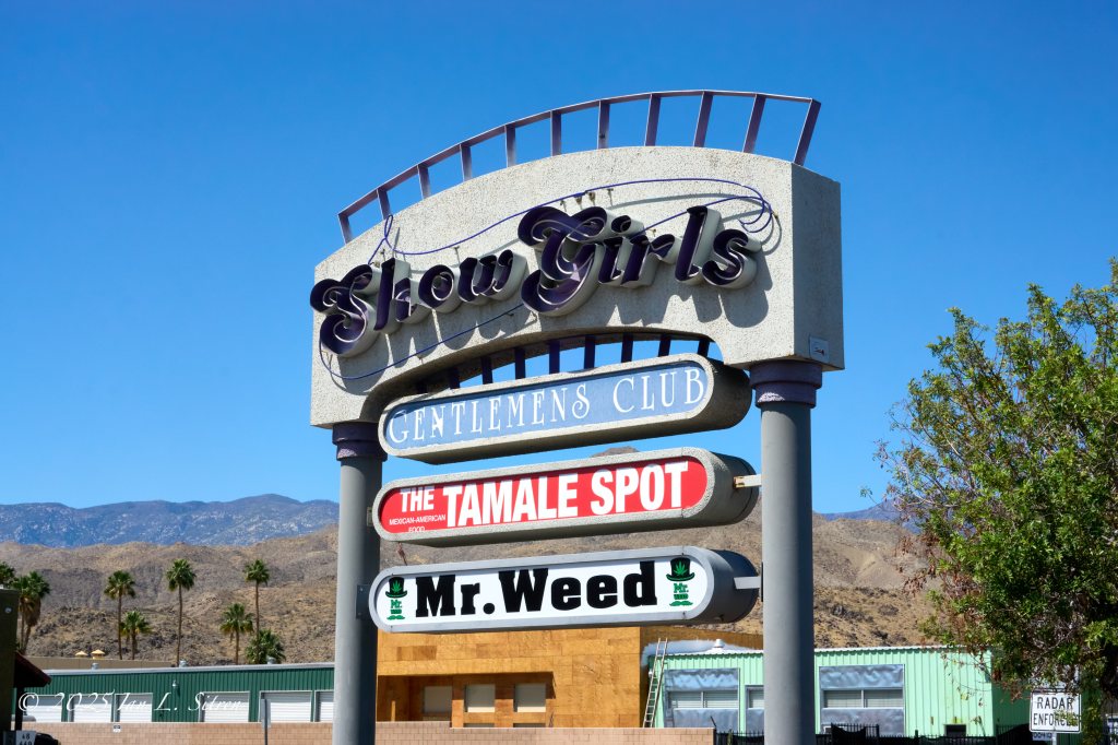 Photographed on Perez Road in Cathedral City, the stacked signage reads like a checklist of vices: Showgirls Gentlemen’s Club at the top, followed by The Tamale Spot, and finally Mr. Weed at the base. Neon-lit adult entertainment, Mexican-American food, and a cannabis dispensary — all sharing one stucco arch like an accidental monument to indulgence. Whether intentional or not, the visual alignment is perfect. And no, I didn’t rearrange a thing.