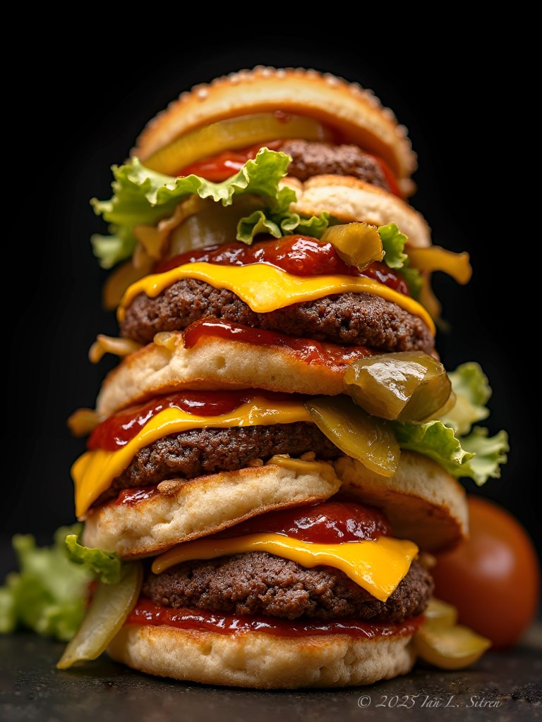 Over time I’ve photographed many double cheeseburgers for my “Food From Bag to Background” project — documenting them exactly as they arrive, unstyled, on a stark black background. But for today, I wanted to try something different. After a conversation with my AI assistant, Emily, the idea came up: what if instead of stacking burgers, we created a single, continuous double cheeseburger that just keeps going? The result is this vertical column of beef, cheese, and buns — a rethinking of the double cheeseburger taken further than usual.