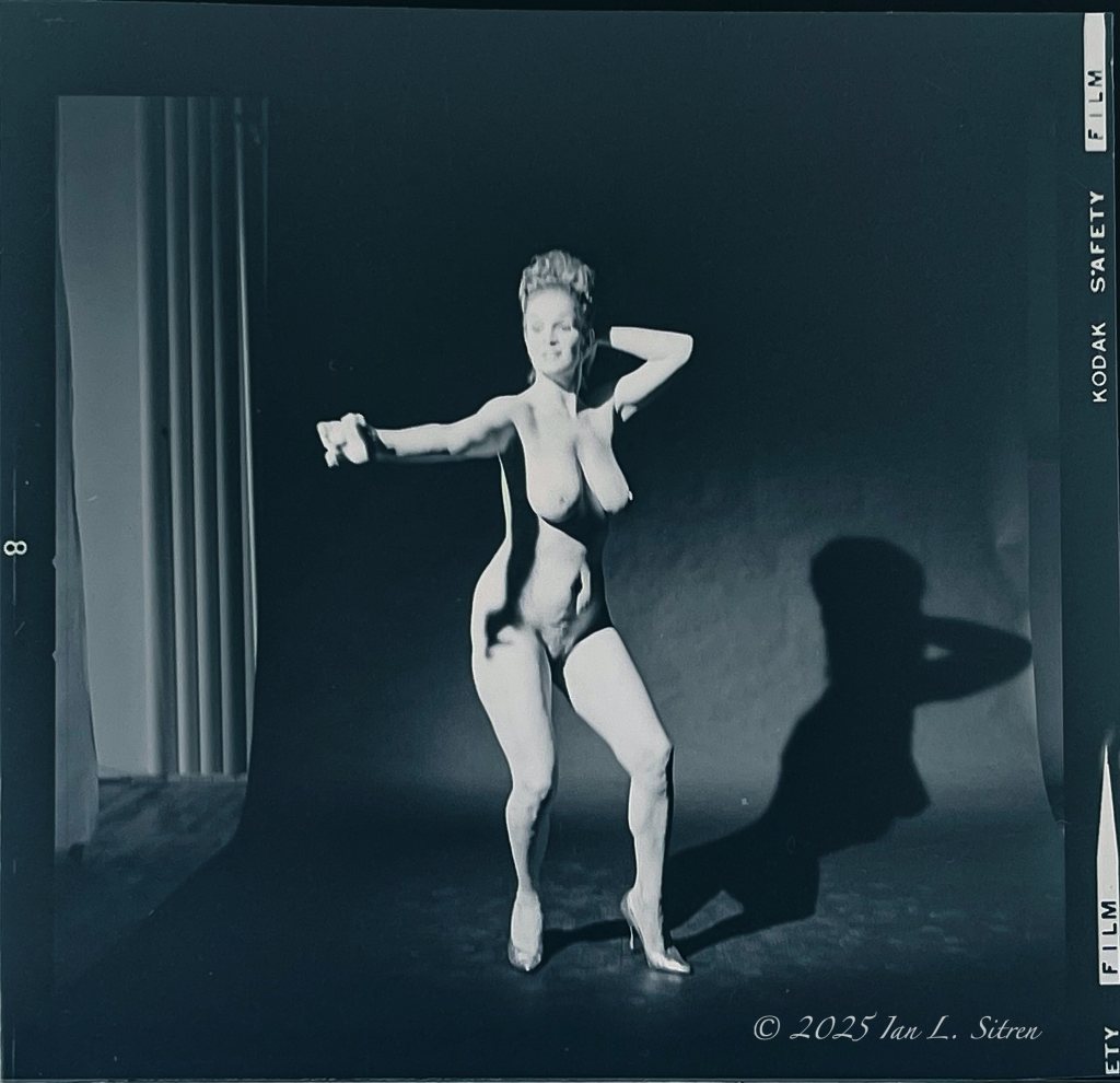 This original medium-format negative, shot sometime between 1960 and 1964, captures a nude model posed in a studio. The setup is simple: a seamless backdrop, a strong key light from the left casting a sharp shadow, and the model in stiletto heels holding a pose as she is dancing. The frame number in the rebate and the imprint from a Hasselblad 120 back place it firmly in the working methods of the era.