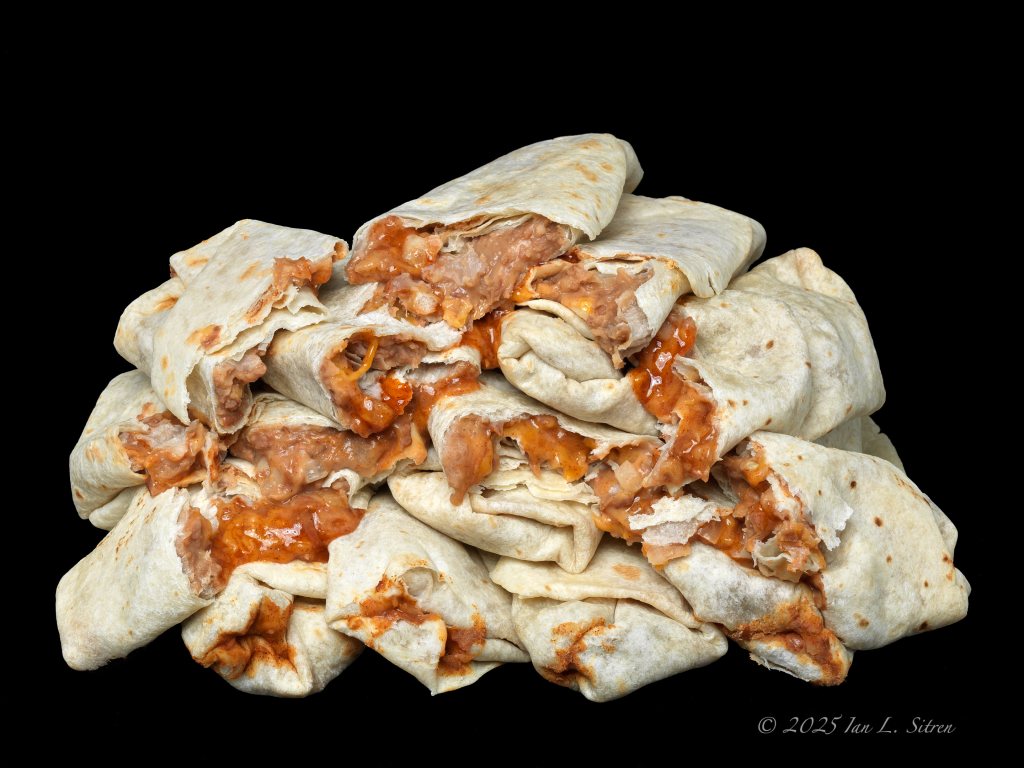 For this year’s photo, I went with four falafel wraps, set against my signature black background. Three wraps are arranged along the base, with a fourth stacked above. Each one features sesame-crusted falafel tucked into pita bread and layered with fresh tomato, pickled vegetables, greens, and tahini sauce—exactly as it came, with no styling or edits.