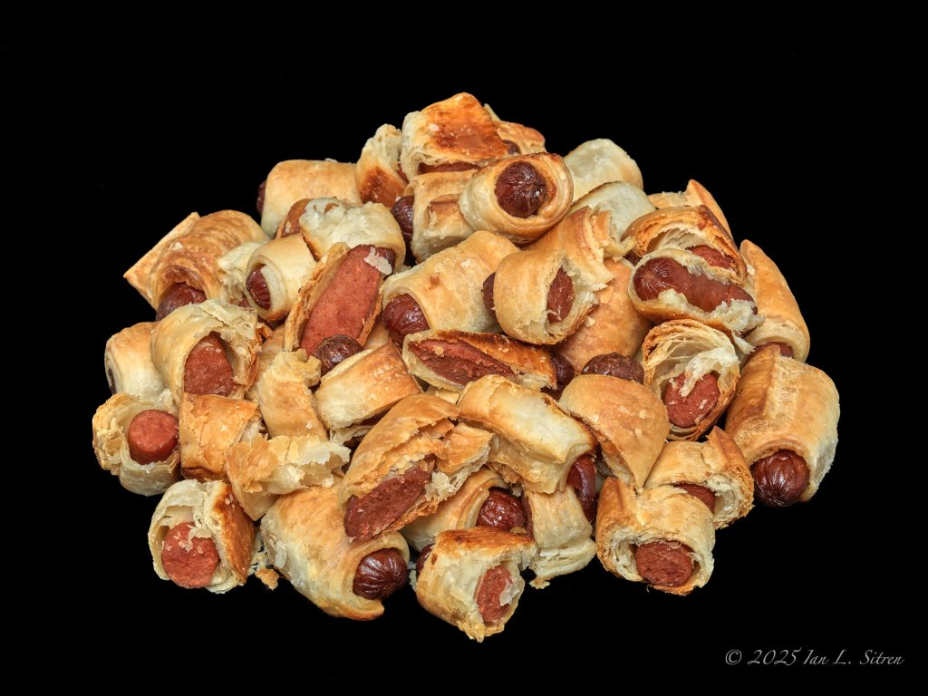 For National Pigs In A Blanket Day, I photographed Hebrew National beef franks wrapped in puff pastry, baked straight from the box. After coming out of the oven, I dropped them onto a black background and shot them as they landed. A few were cut open to show the interior, but otherwise there was no styling, no arrangement—just the food as it is.