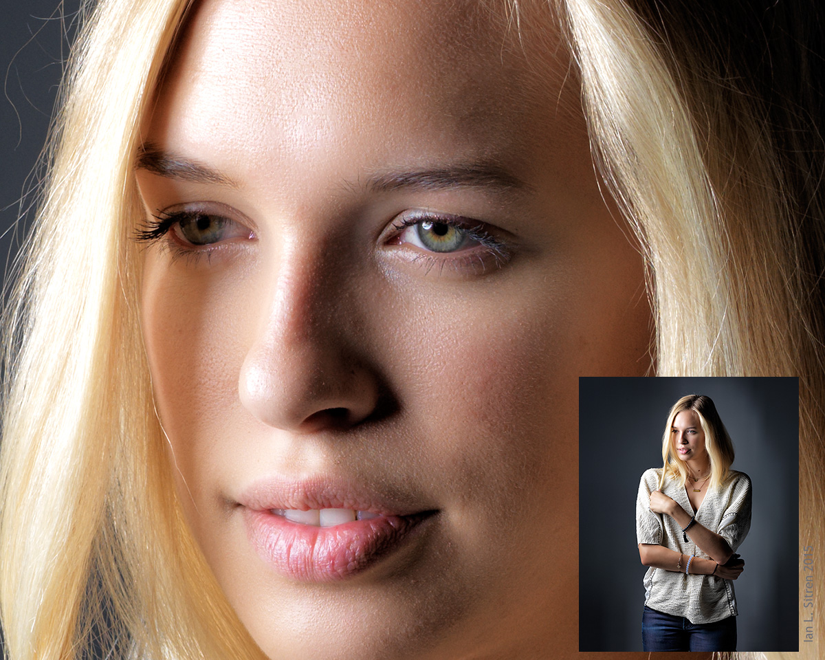 Now look at the details of her beautiful face. Look at the detail in just the pupil of her eye, the pure and perfect colors, the real life skin tone and hair color. Look at the color and detail of her lips. This is what a photograph looks like when it is shot right and especially with such amazing camera and lighting equipment.