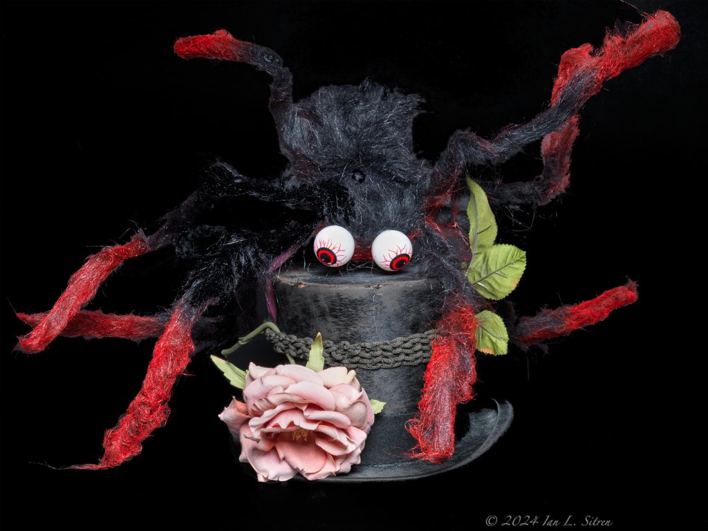 Found this lurking in the bedroom corner: a strange, spidery hat that’s a Halloween relic—or maybe a piece of something else altogether… Alongside it, five empty champagne bottles and a risqué note, written in red lipstick and signed by a mysterious Mrs. Dumont. Keeping the note, of course… but the hat? It’s ready for its close-up.