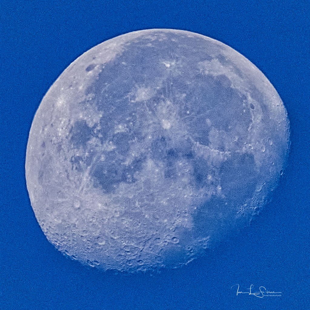 The Waning Gibbous Moon in the morning daytime sky. Distance to the Earth approximately 231,000 miles. Photographed 08-06-2023 Palm Springs California.