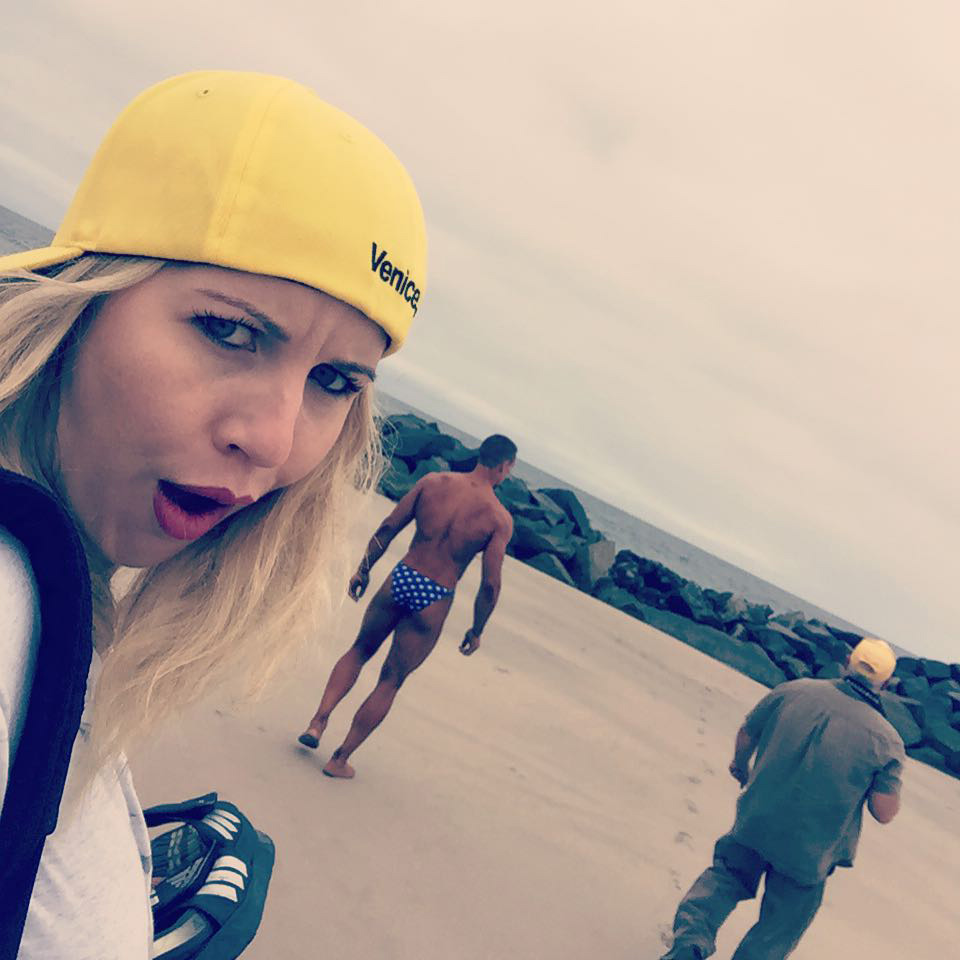Amy Jantz, who is too cute for words and more than beautiful, just could not resist a combination of selfie and behind the scenes photo. Offering to carry my camera bag as her husband Chris Jantz and myself walked out to the rocks at Venice Beach for more of his photo shoot early Sunday morning after his competition at Muscle Beach on July 4th. I thought she was just walking along behind us. Little did I suspect her mischievousness! Just too fun! Thank You Amy!