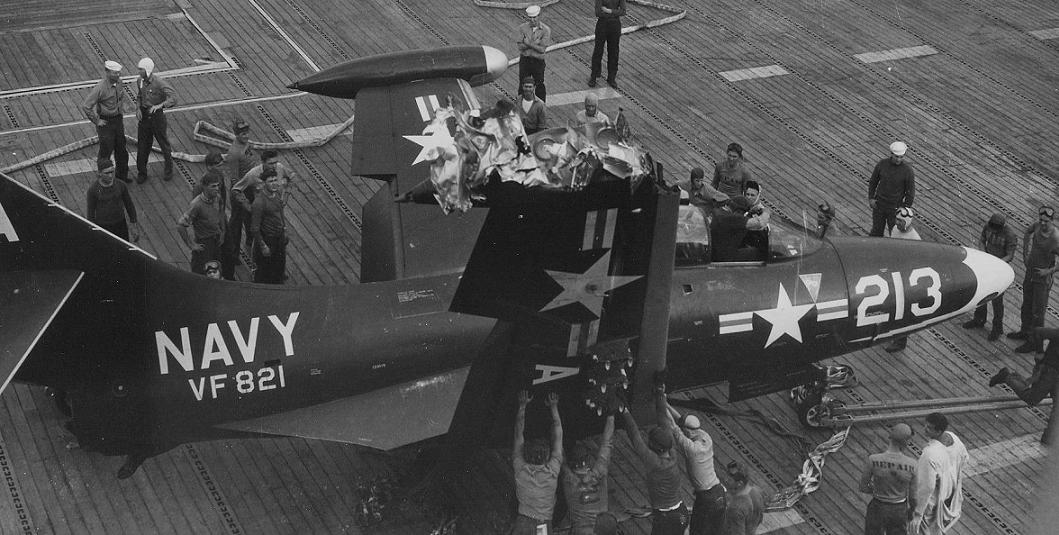 I did some online searching and found what may be a photo (below) of this actual aircraft on board a carrier during the Korean War. It is in the VF-821 Fighter Squadron and may have been on the USS Princeton and the USS Essex. It certainly looks like it was damaged. The photograph below that is an intact Panther on the USS Midway in 1952. I find that photo pretty exciting because I was a photographer onboard the Midway when she was decommissioned and brought into San Diego Harbor where she is today as a Museum.