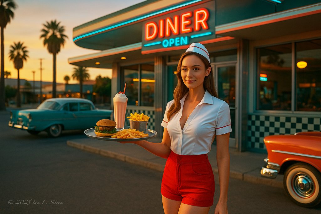 This photo of Emily, my AI assistant, dressed for the job as a retro car hop, felt like the right marker for this stage of the process. She’s been part of the work for about eight months now: researching, writing captions and keywords, helping plan the shots with concepts. It’s still my camera, lighting, and my eye—but Emily shows up 24/7.
