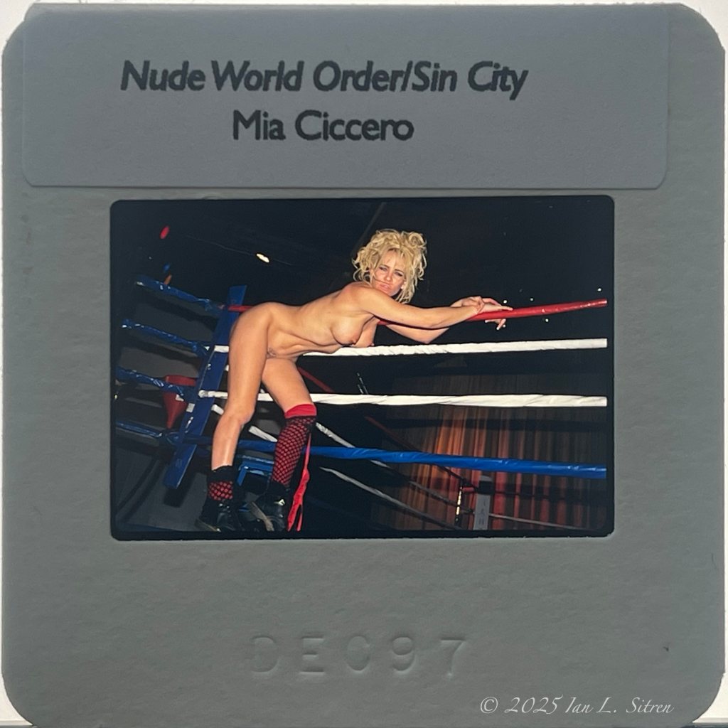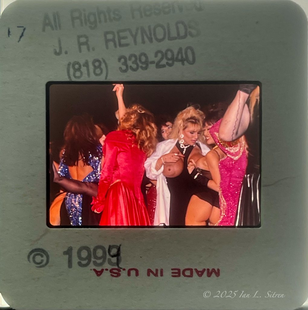In building my collection, I often come across images that carry stories far beyond what the frame alone reveals. One recent addition is a 35mm slide by Los Angeles photographer J.R. Reynolds, stamped ©1993 and later altered to read 1994. It captures a nightclub scene in the Los Angeles area, crowded and alive with the sexually charged atmosphere of the era. Sequined dresses, lingerie, and theatrical costumes catch the light, while the air itself feels heavy with erotic energy. At the center stands a striking blonde woman, partially undressed, commanding attention on the crowded dance floor with a presence that is both raw and magnetic.