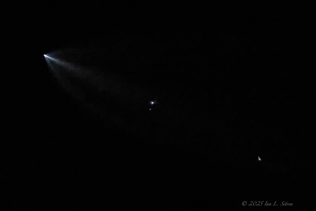 SpaceX Falcon 9 launch of 23 Starlink satellites to low-Earth orbit from Space Launch Complex 4 East (SLC-4E) at Vandenberg Space Force Base in California. Seen here with booster rockets falling away. The view from Palm Springs.
