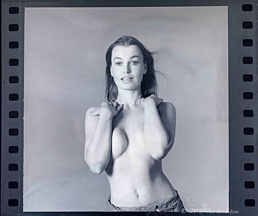 Now in my collection—a striking black-and-white negative of actress Linda Meiklejohn, shown here in a rare and intimate pose not often seen in her career.