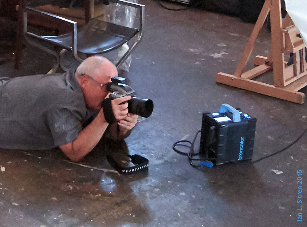 Yes this is me crawling around on the floor of an artist’s studio in Los Angeles, for the last of three parts of our photo shoot. The first of the day was around a pool in a garden setting. The second was in an upstairs crowded fun art deco looking apartment in the Melrose area.