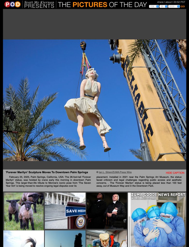 One of my photos syndicated by ZUMA Press from last week’s relocation of the “Forever Marilyn” statue in Palm Springs was licensed and featured in “The Times” of London, and other publications around the world, as well as selected as a Picture of the Day by ZUMA Press. I’m pleased to have been selected and featured for capturing this 26-foot icon being lifted and moved to it’s new location resolving a long-standing legal dispute.