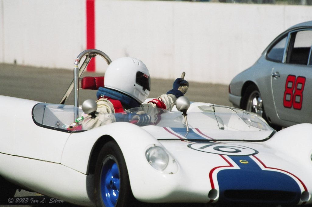 I think he was telling the other driver that he is in 1st place. Vintage Auto Racing Association racing at California Speedway. From my photo archives.