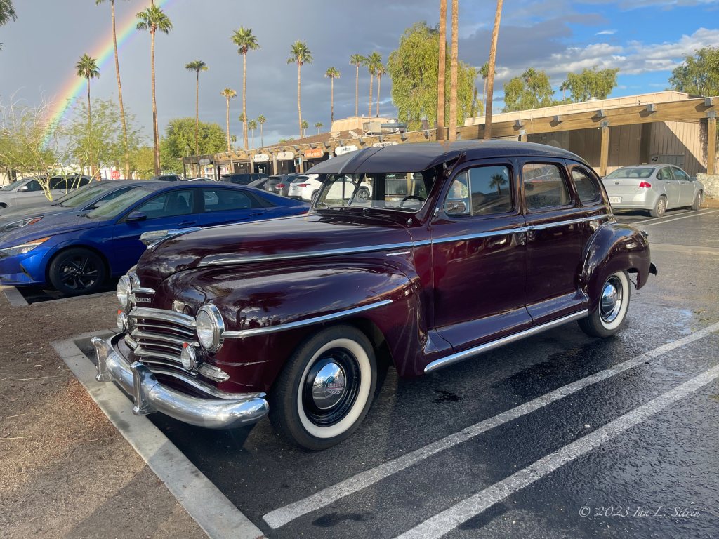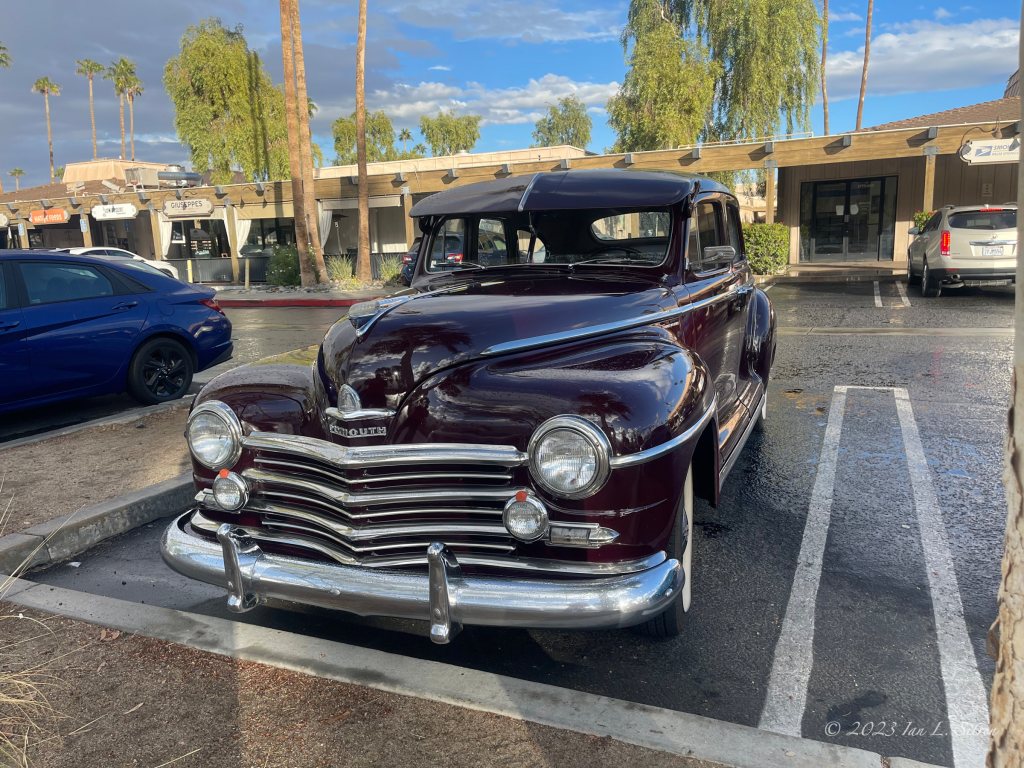 Parked in front of the Post Office this afternoon. I know it is a Plymouth Special De Luxe because that is what the emblems said on the car. 12-20-2023 Palm Springs California