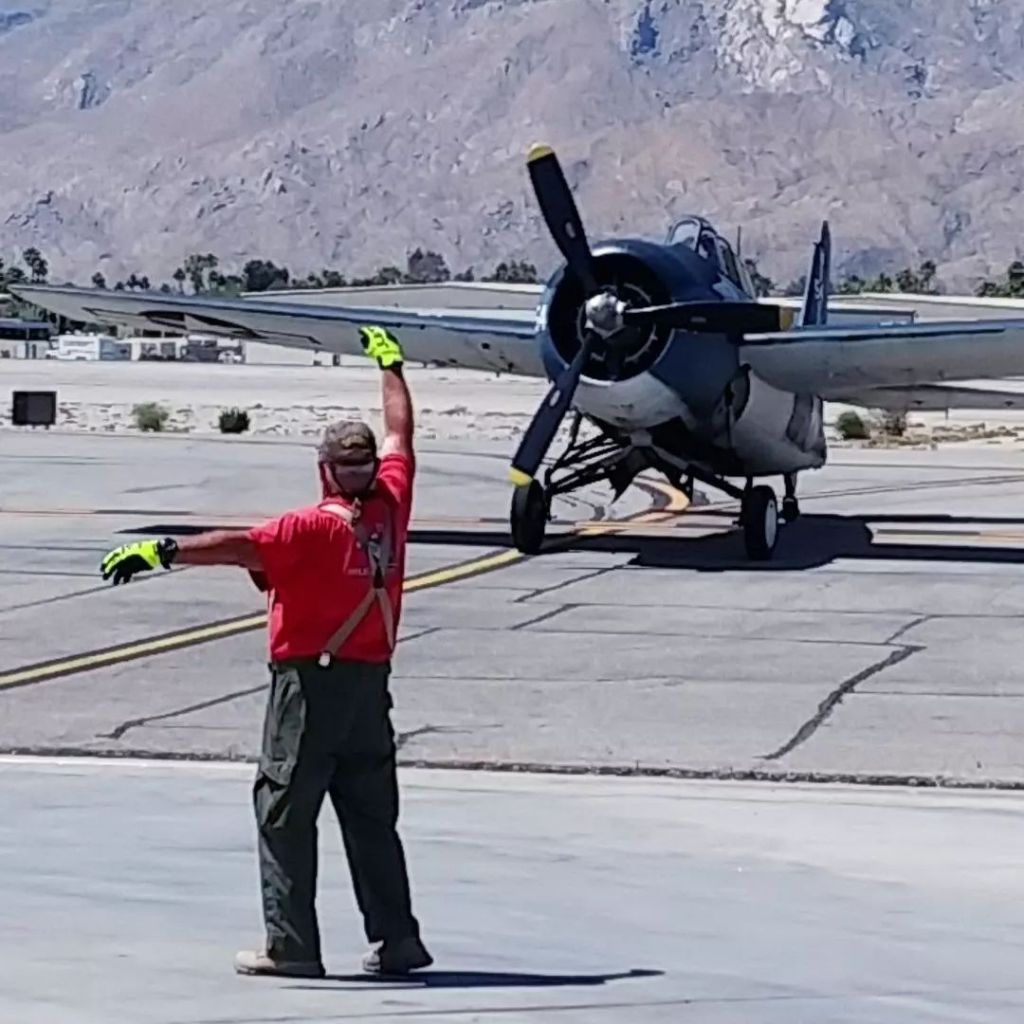 A World War II FM-2 Wildcat visiting us today at the Palm Springs Air Museum. Me in the red shirt.
