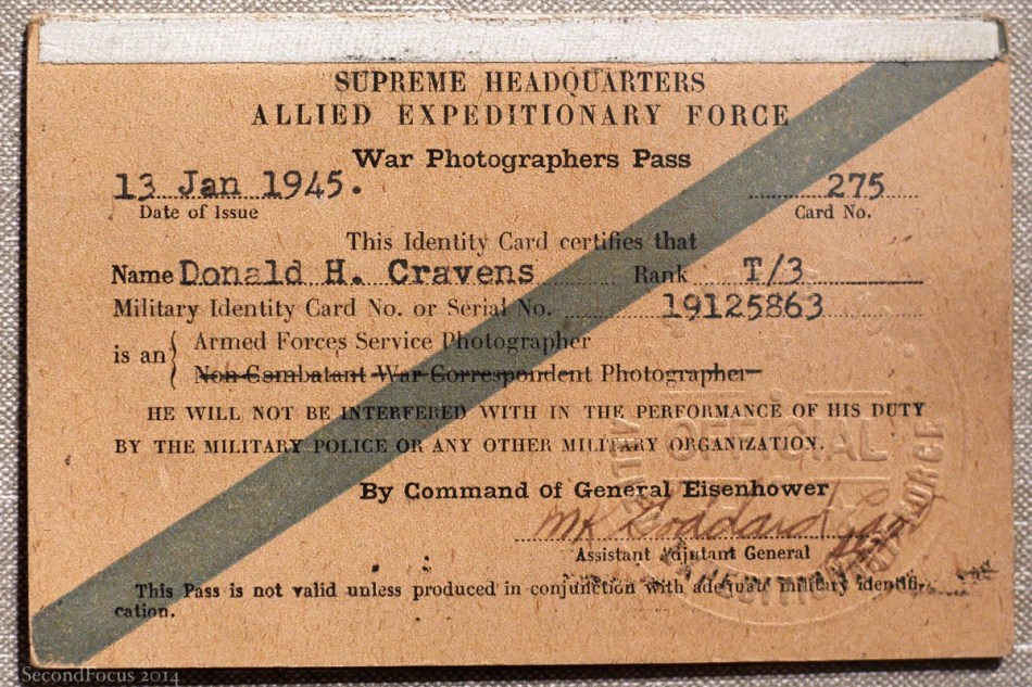 This is something you certainly won’t see everyday. A War World II “War Photographer’s Pass” issued to Donald H. Cravens. I photographed this yesterday at a showing of the photographs of Don Craven at the Walter N. Marks Center for the Arts at College of the Desert in Palm Desert California.